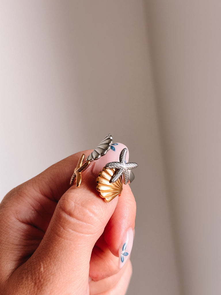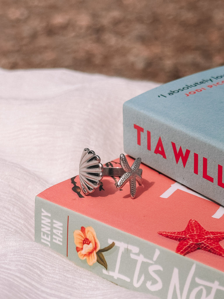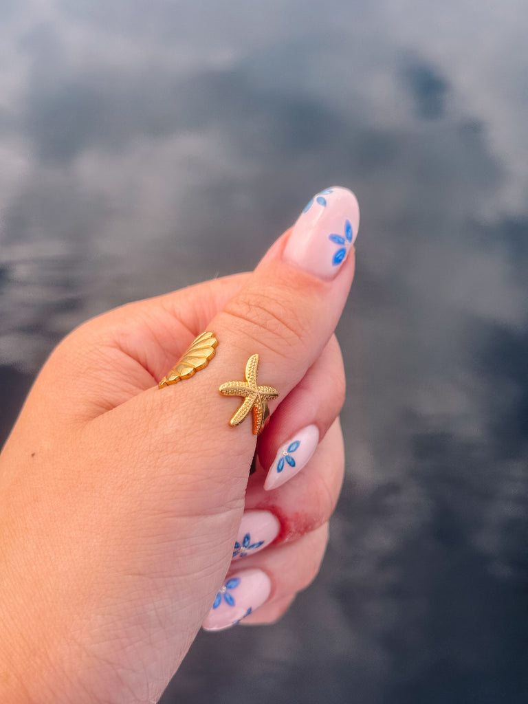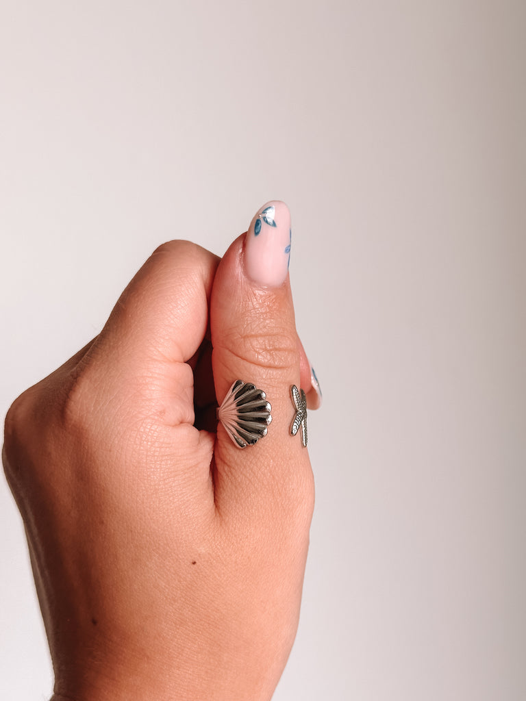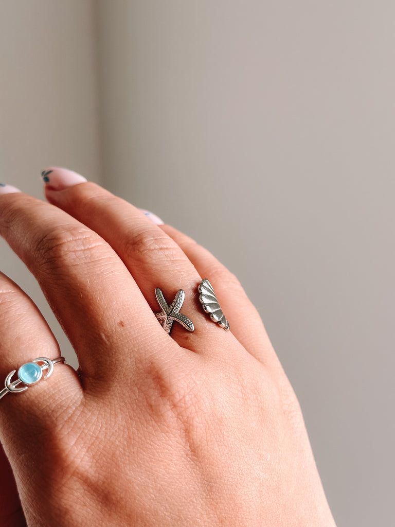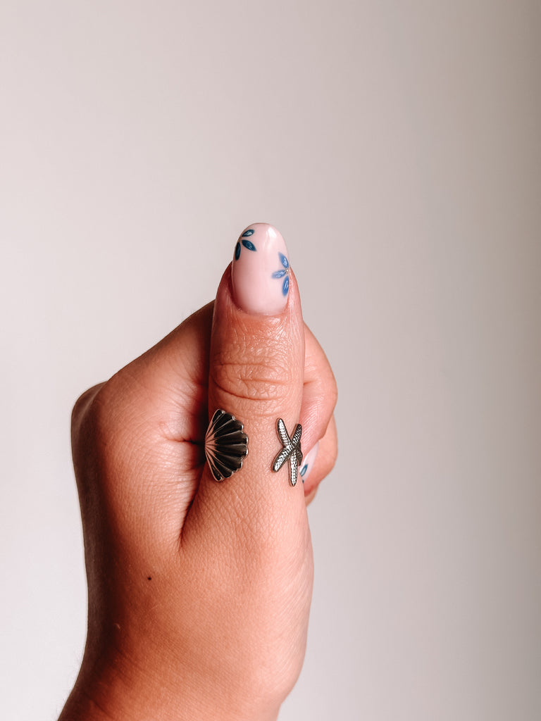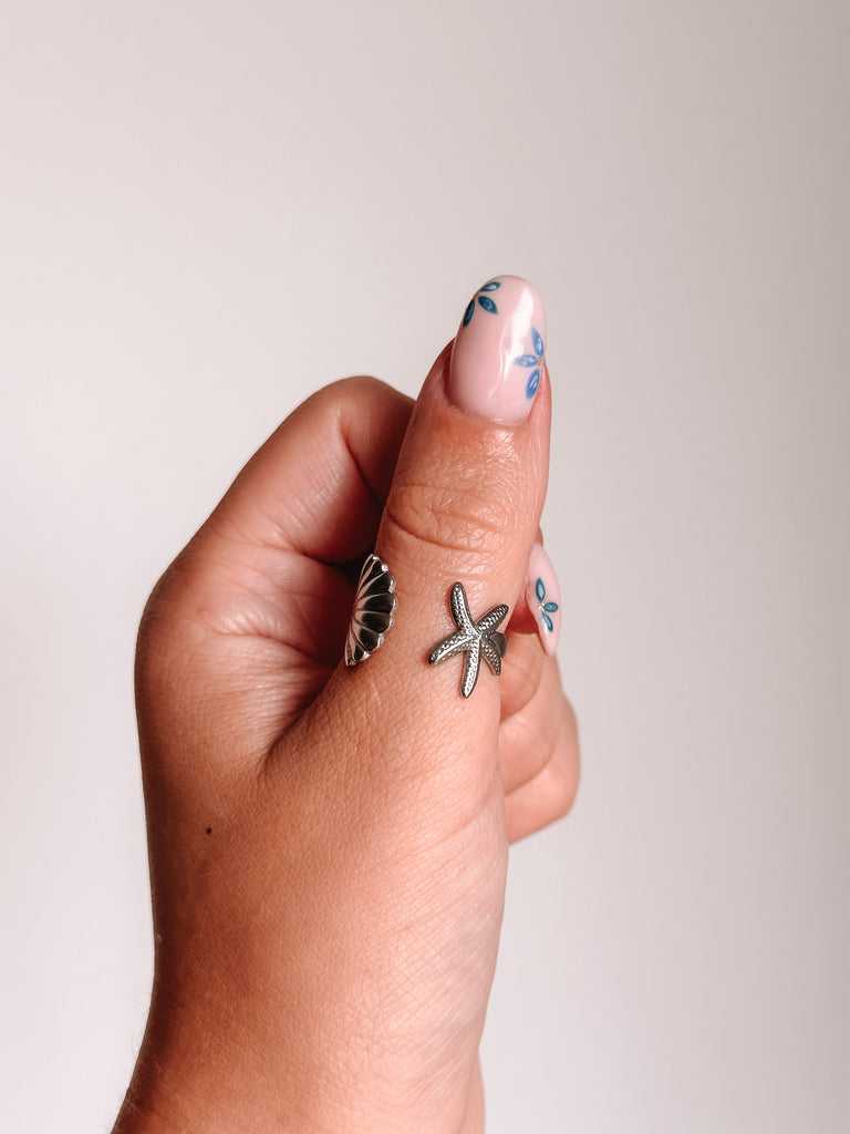 Featuring a starfish and shell this ring is stainless steel and fully adjustable.