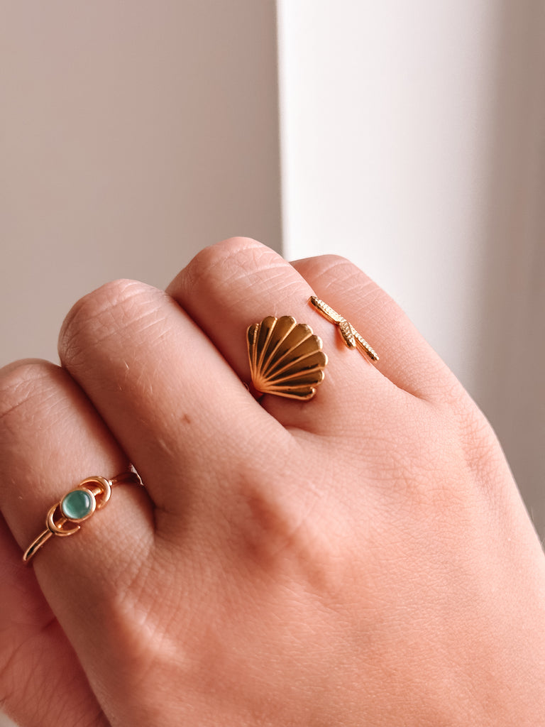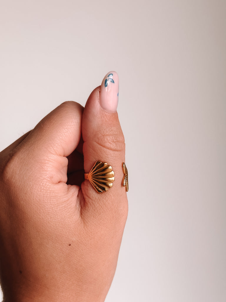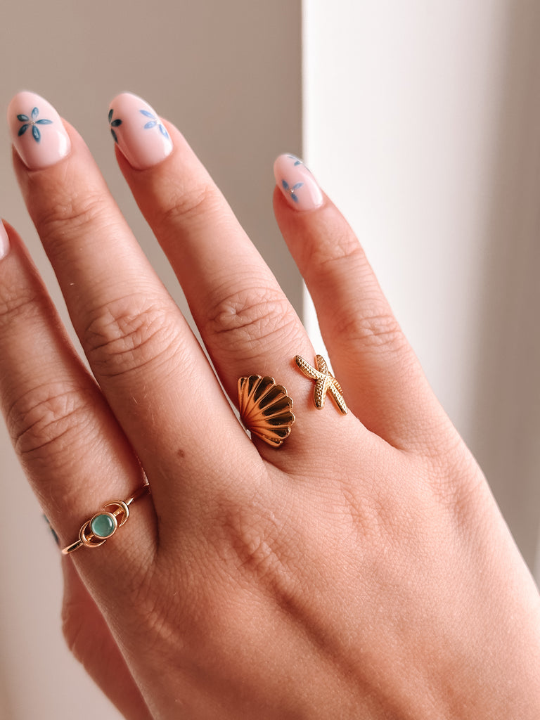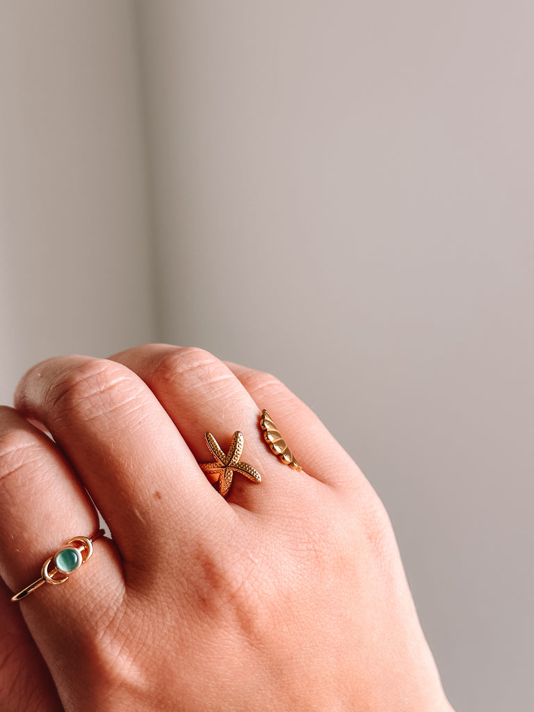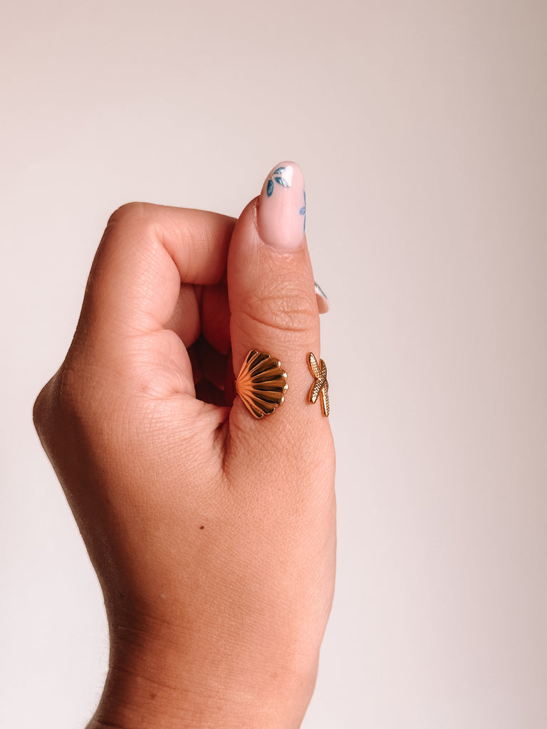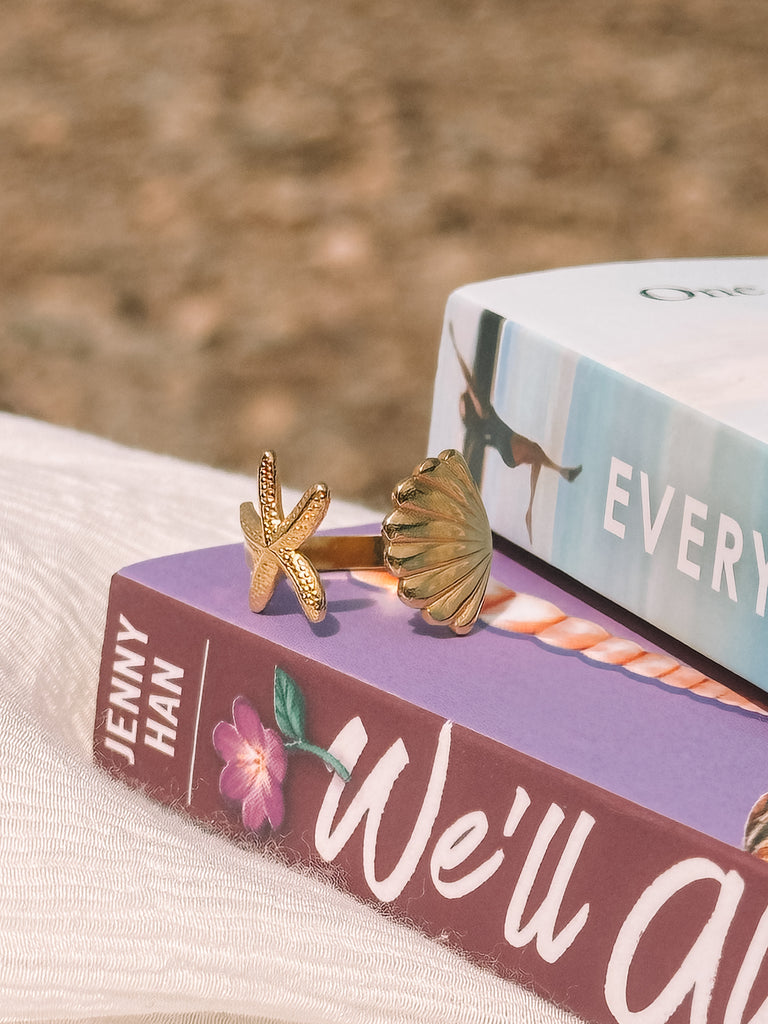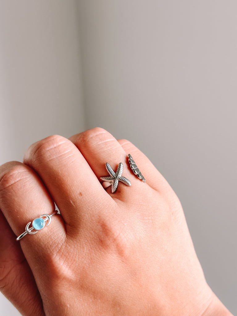 Featuring a starfish and shell this ring is stainless steel and fully adjustable.