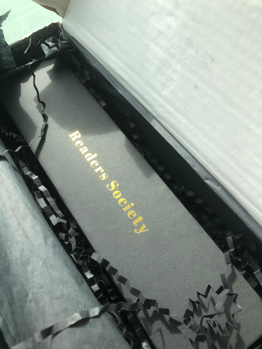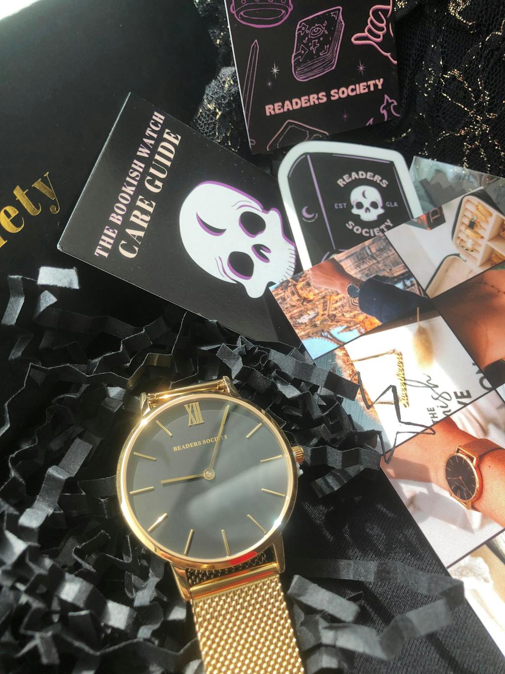Presented in a custom black pull draw watch box featuring Readers Society branding in gold foil.