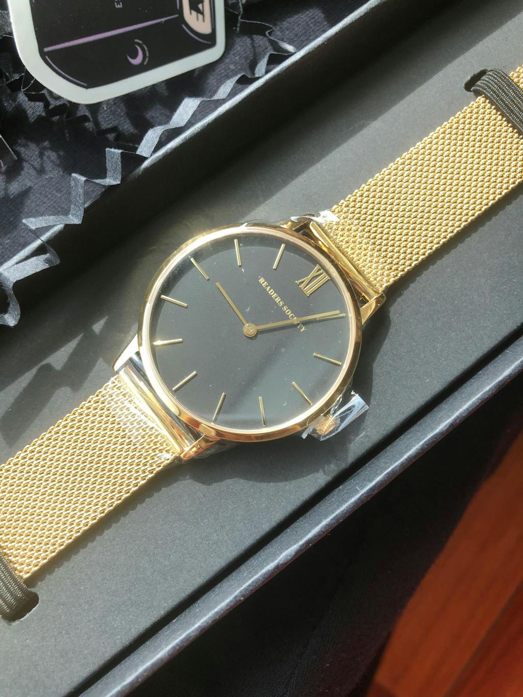 You will find subtle Readers Society branding on the watch face, mesh strap clasp, crown and inside case.